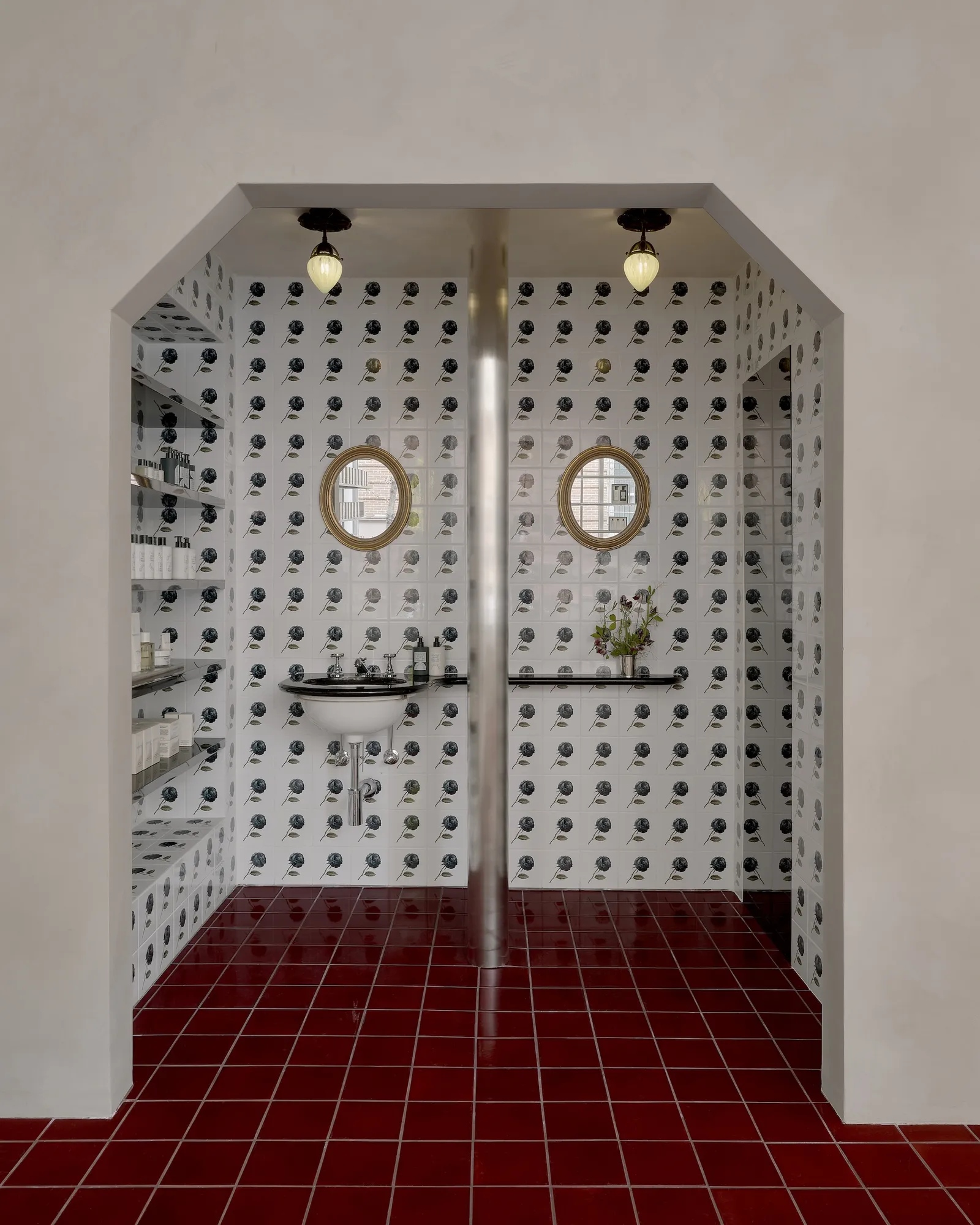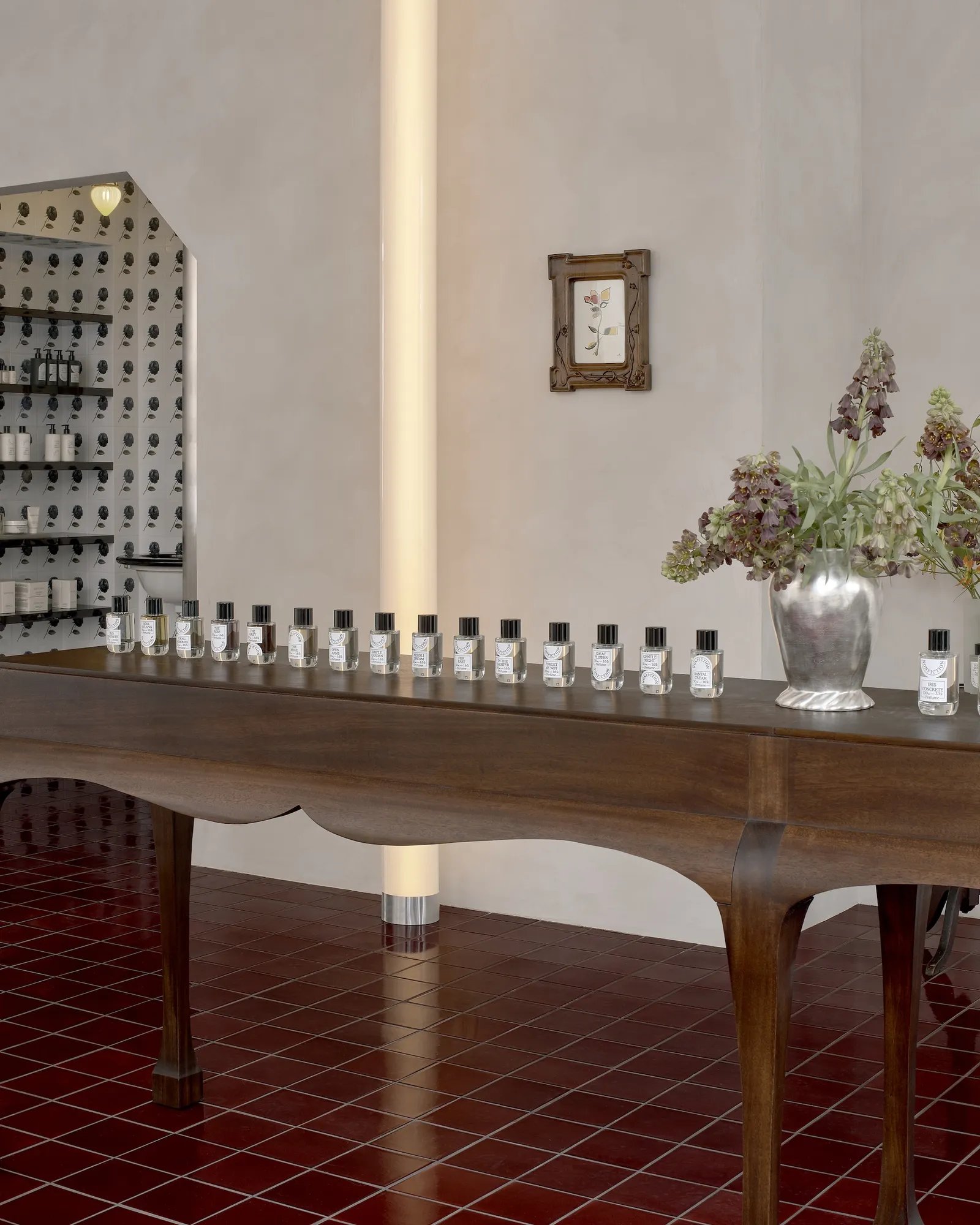 На первый взгляд интерьер кажется лаконичным: светлые стены с известковой отделкой, спокойная палитра, рассеянный свет. Но при более внимательном изучении раскрывается его многослойность. Пол выложен глянцевой плиткой глубокого винного оттенка, которая «заземляет» пространство и добавляет ему драматизма. В центре — деревянный стол для экспозиции ароматов, выполненный в духе поздневикторианского стиля по дизайну Дуга Макколлоу. Ниша для тестирования средств оформлена плиткой с черными розами, вручную расписанной художницей Пилар Алмон.
