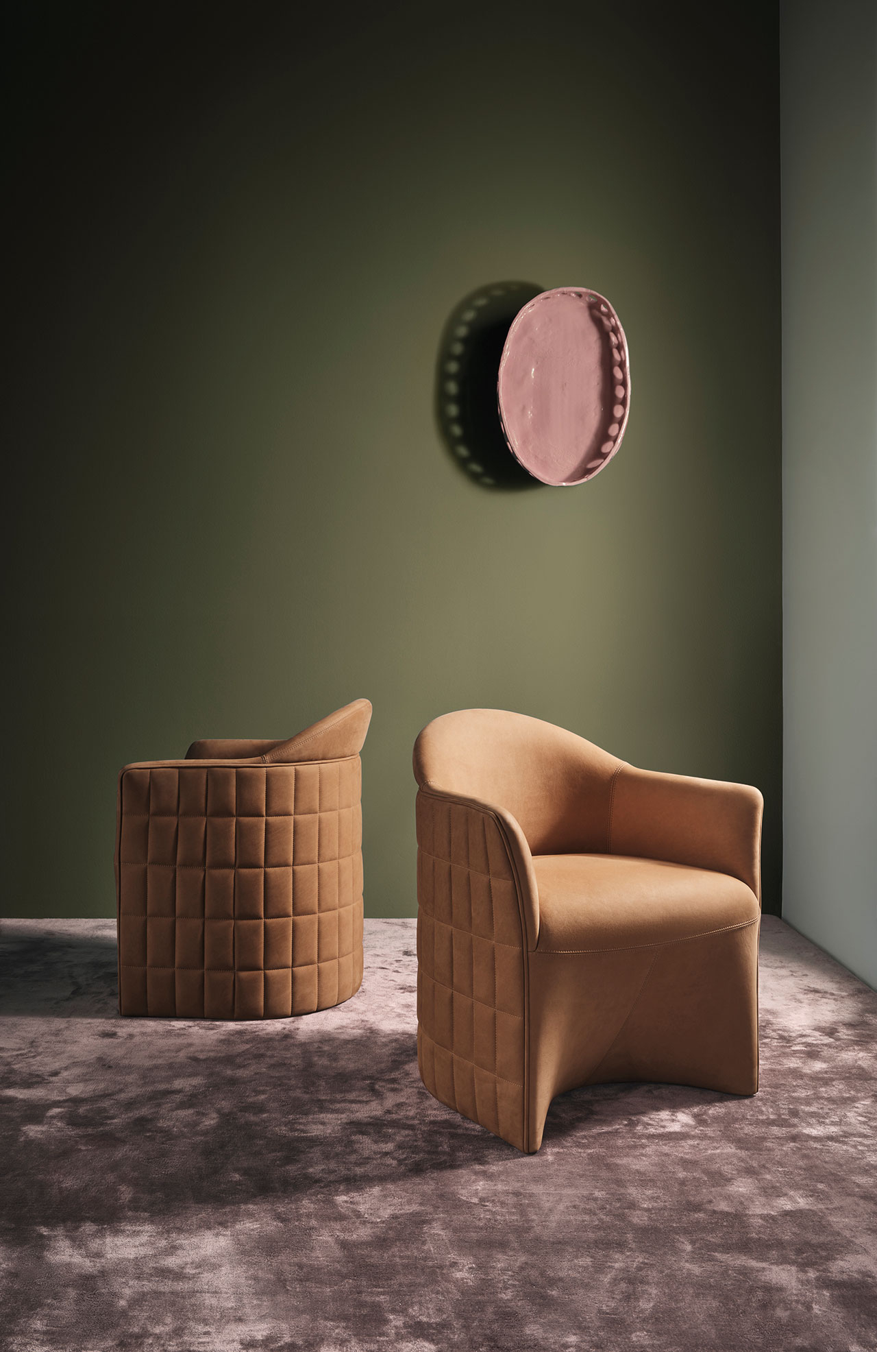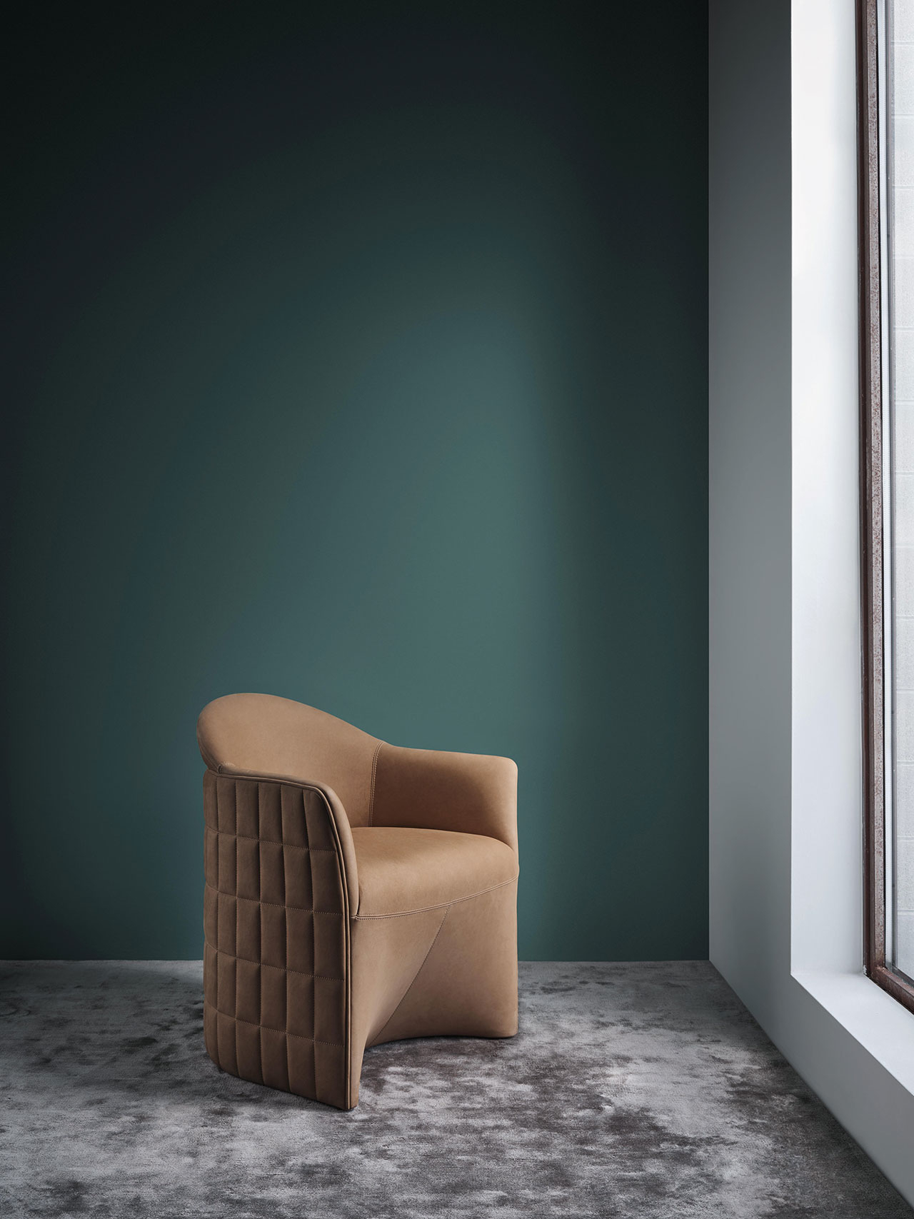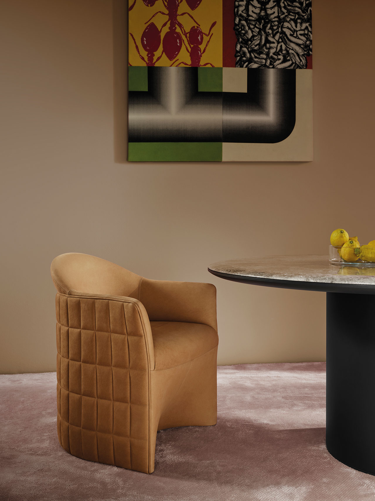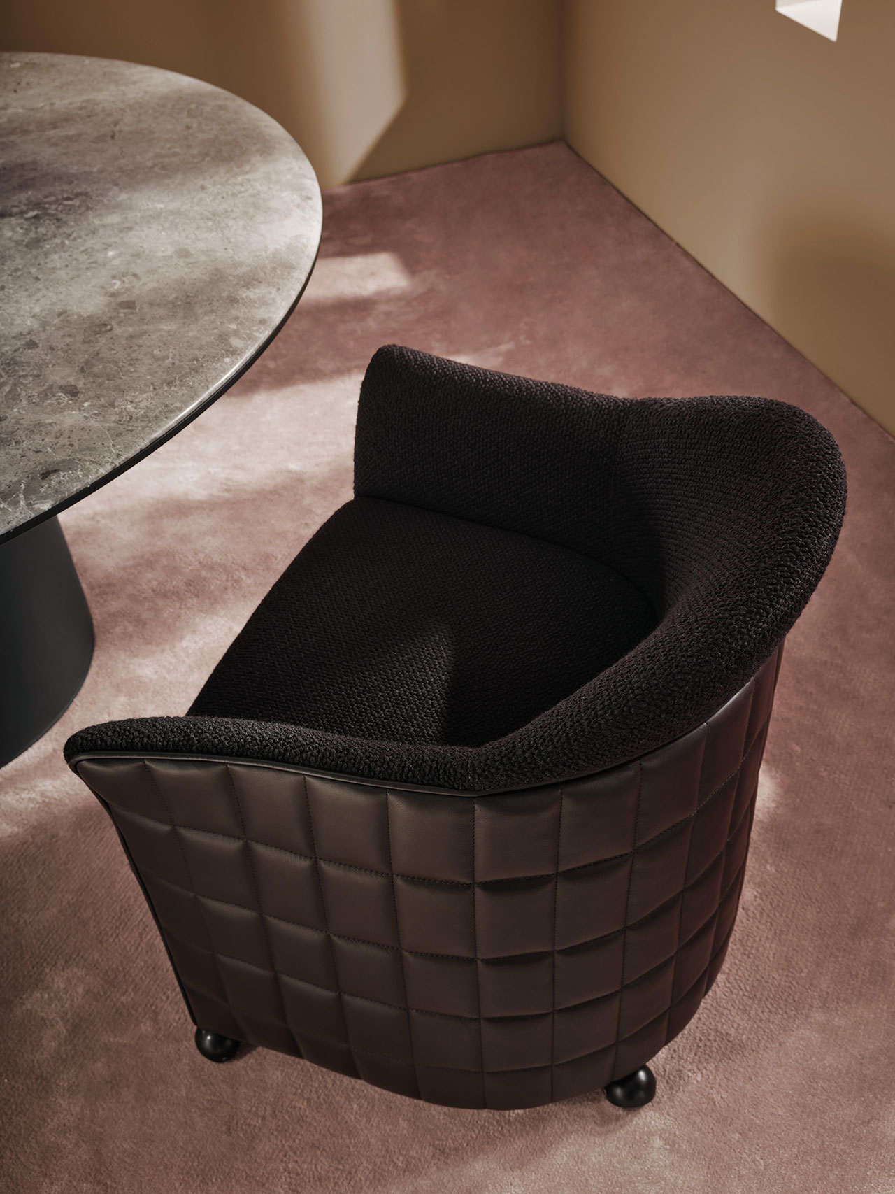 Пожалуй, главная отличительная особенность — стеганая отделка спинки и подлокотников с внешней стороны. Простые на первый взгляд квадраты на изогнутой поверхности требуют большого мастерства обивщика: даже из-за миллиметрового отклонения шва может «поехать» весь паттерн. Гладкая кожаная обивка сочетается с фактурной тканью сиденья — за счет этого создается эффектный контраст строгой геометрии и тактильности.