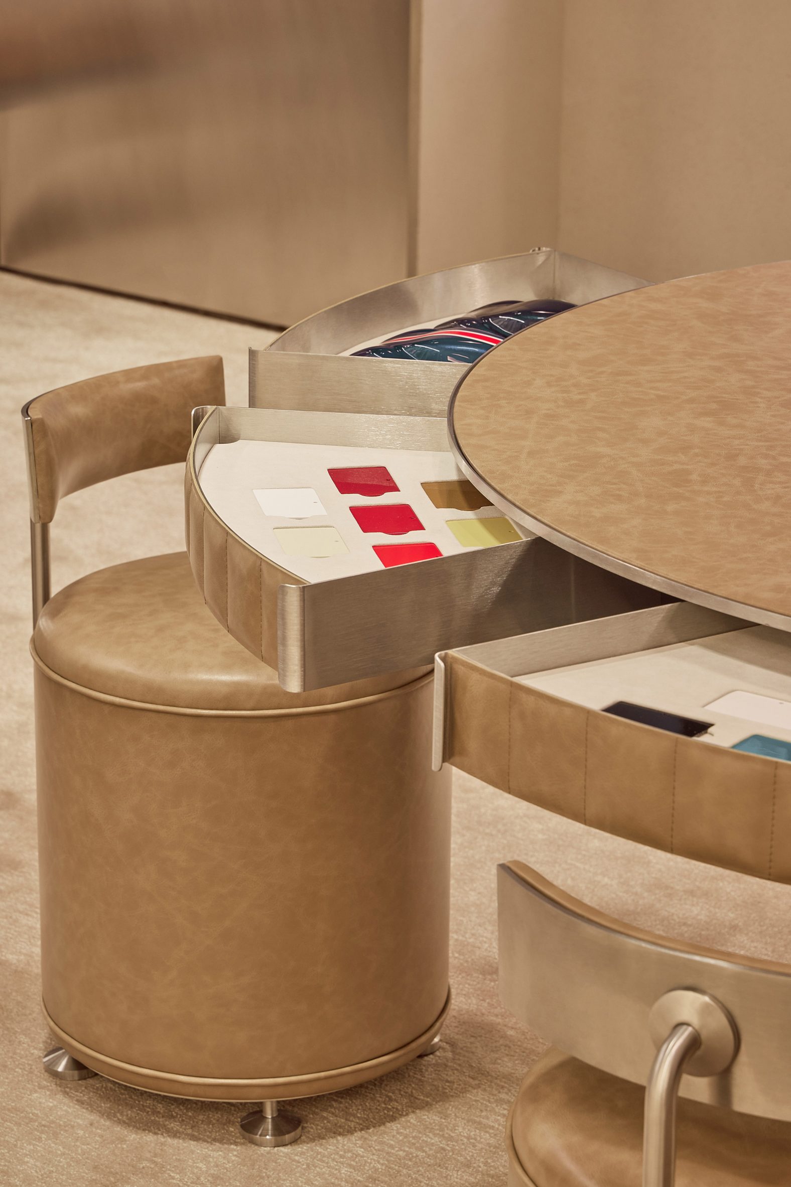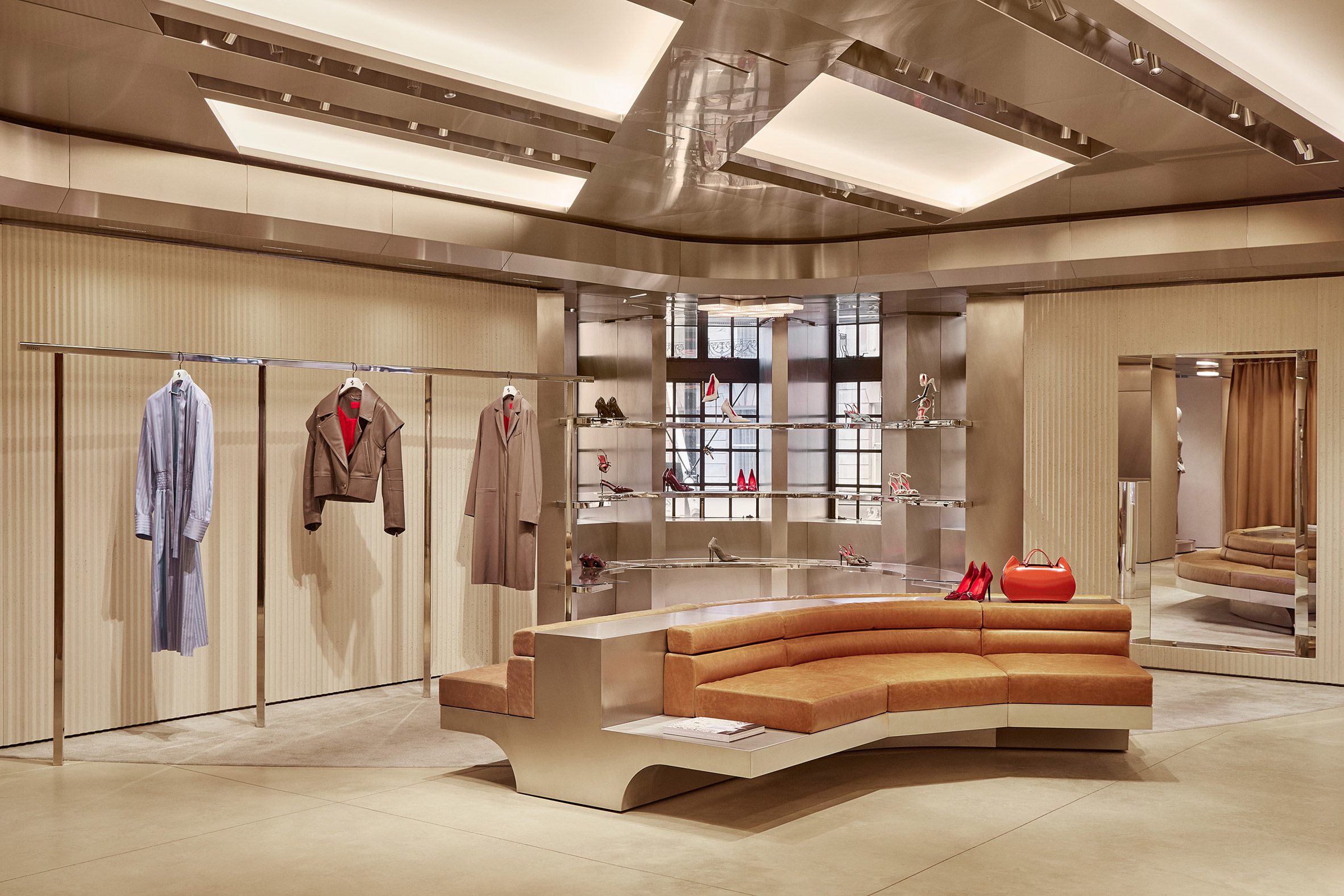 Панели из нержавеющей стали, отполированные вручную, бетон, кожа, алюминий, стекло — повторяющиеся фактуры «перетекают» из одного пространства в другое, связывая их в единую гармоничную композицию. По словам компании, выбор материалов вдохновлен Ferrari Officina, коллекцией весна-лето 2026, представленной на Неделе моды в Милане.