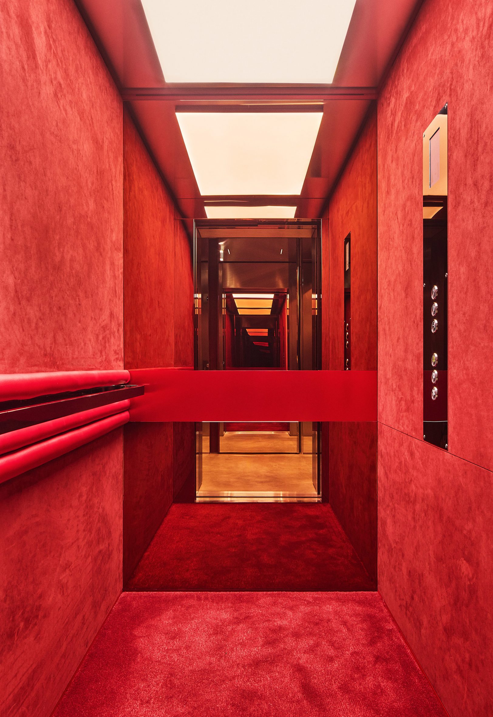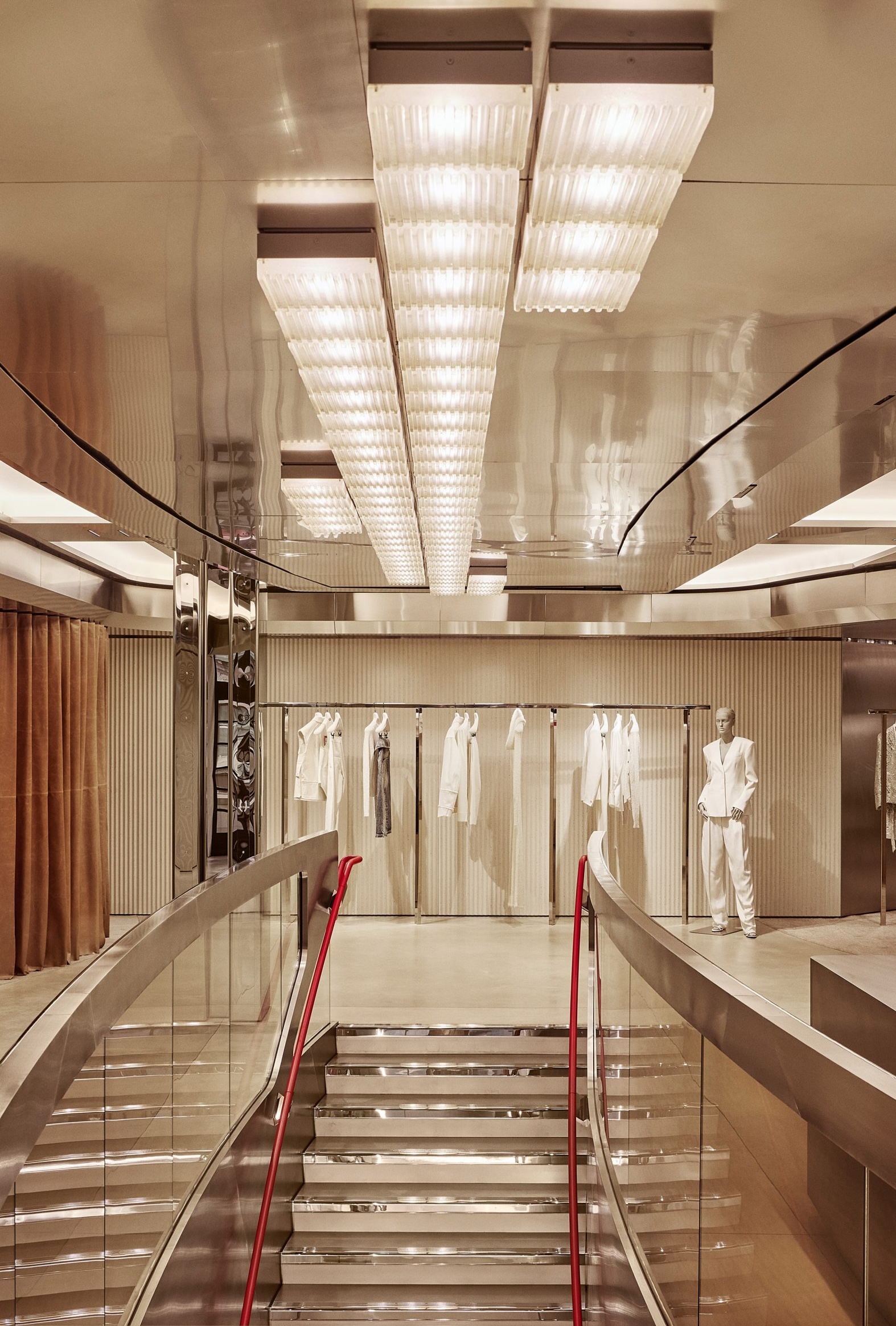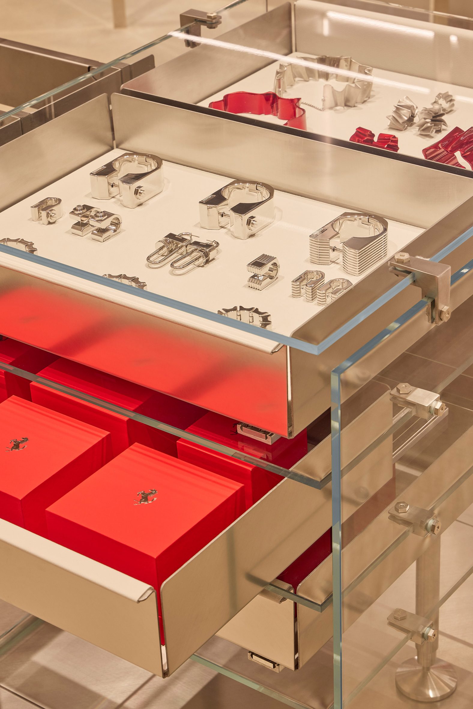 Нейтральную палитру разбавляют акценты в фирменном красном цвете Ferrari. Яркие вкрапления появляются повсюду — от изящных поручней, ковров и подушек диванов до манекенов и упаковки, становясь основной интерьера на фоне прозрачных и отражающих поверхностей.