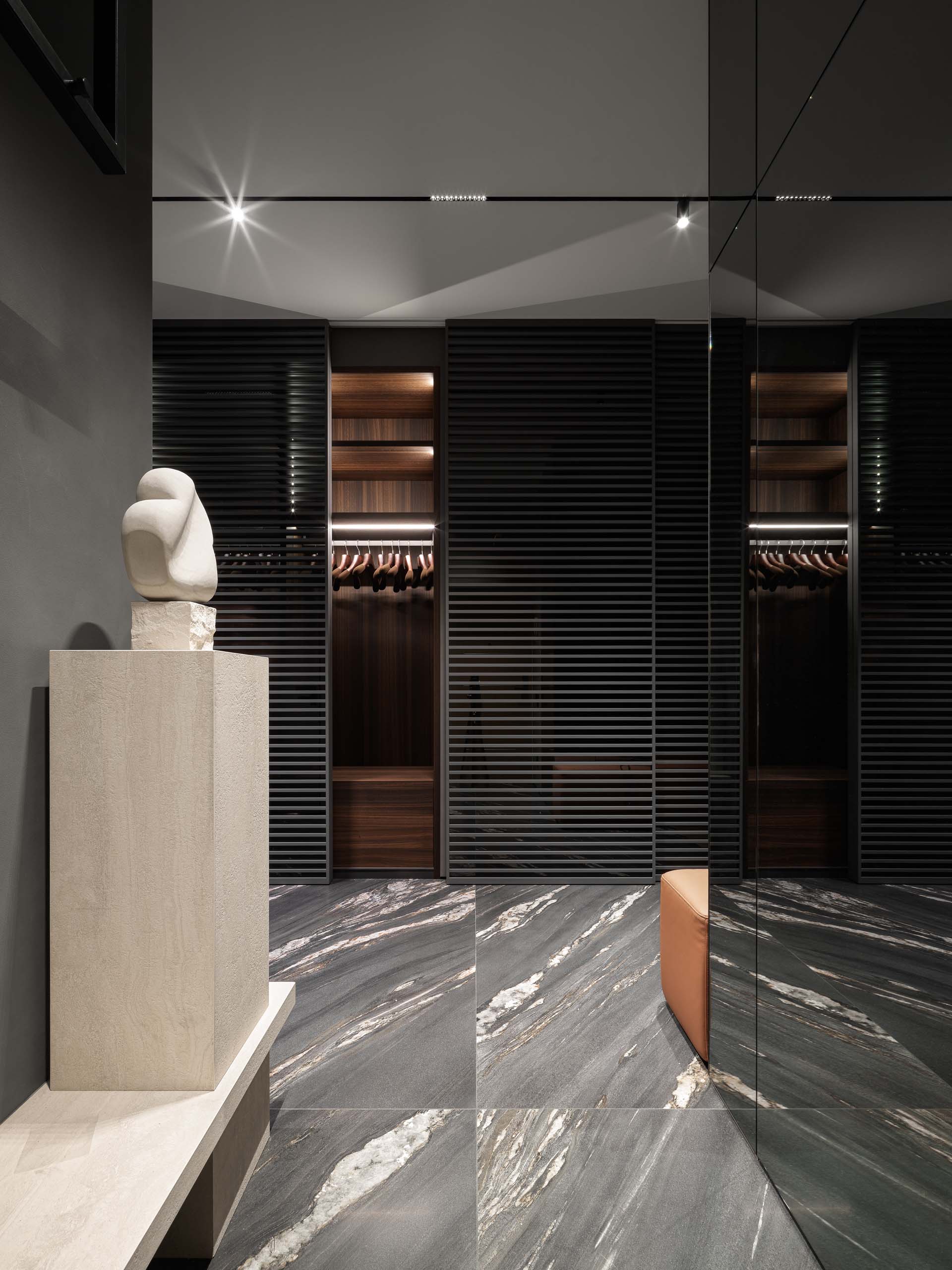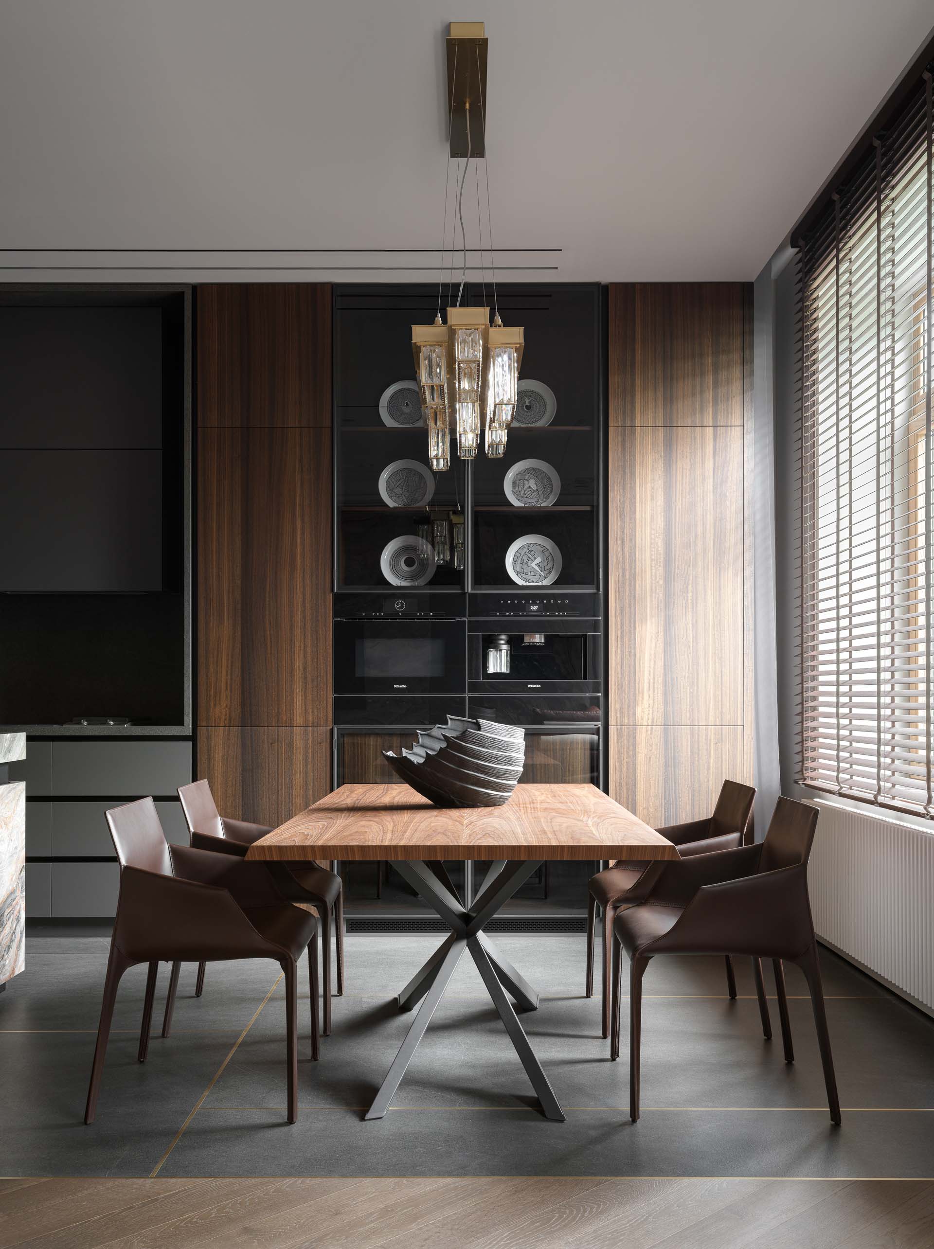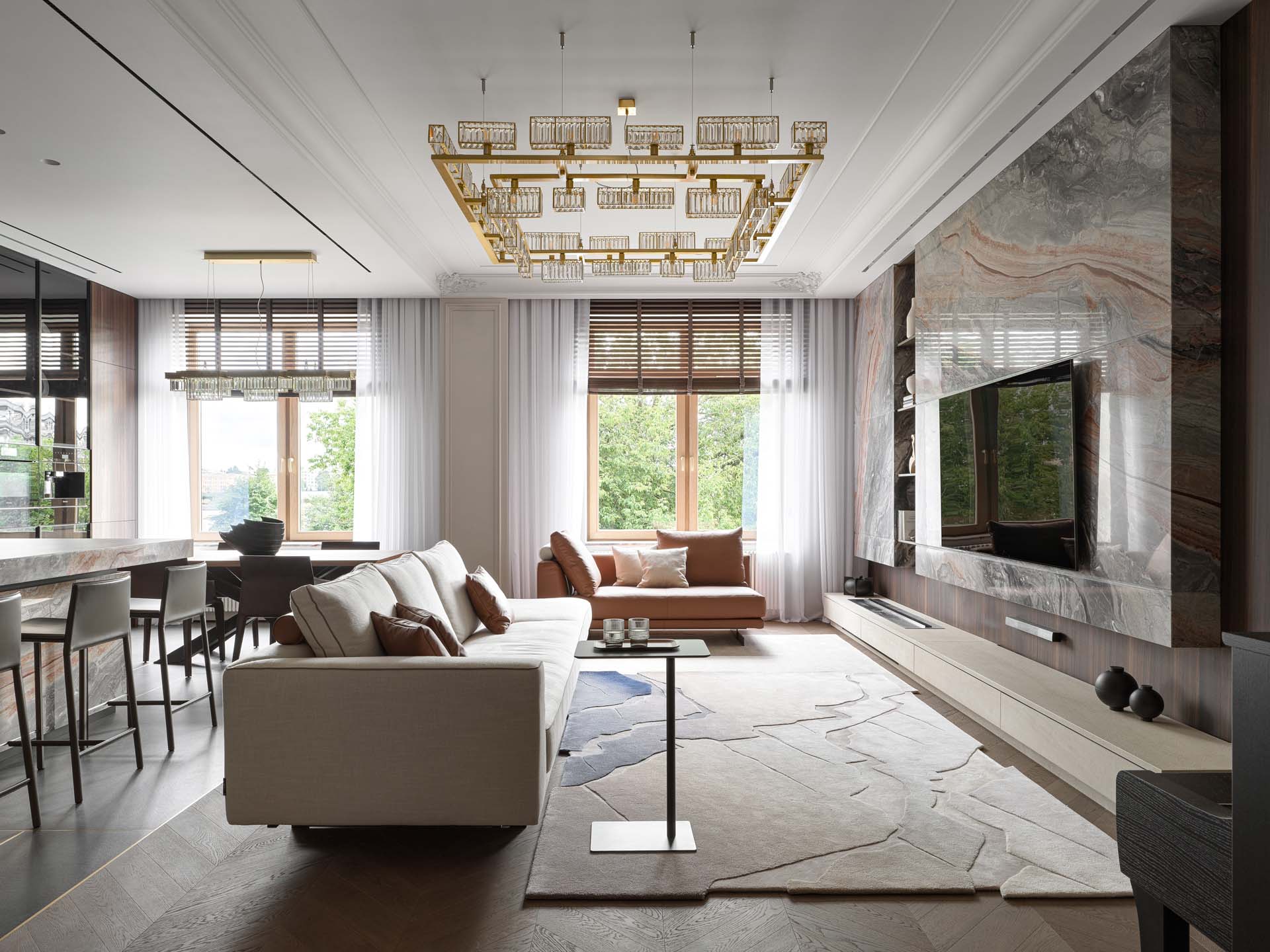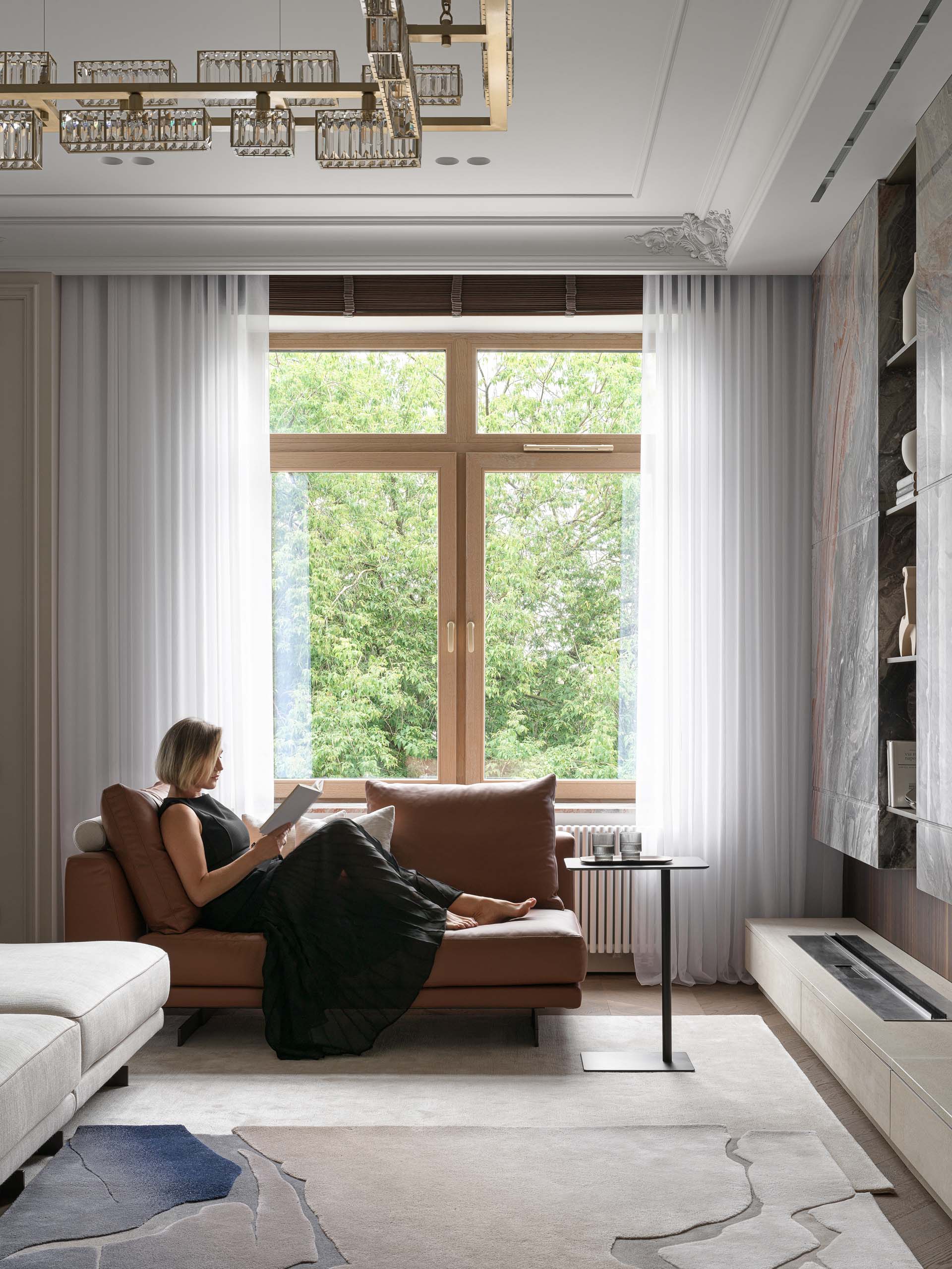 Основу цветовой палитры составили оттенки мореного эвкалипта, рыжей кожи, мрамора и темного гранита. Для гостиной дизайнеры также продумали сложную конструкцию из металла, которая держит мраморную стену. Вес только самого мрамора составил больше 500 кг. С обратной стороны на той же стене размещена четырехметровая парящая столешница без опор. «Это решение потребовало долгих часов работы над проектными решениями и сложными процессами стыковки — но все удалось», — комментируют дизайнеры.