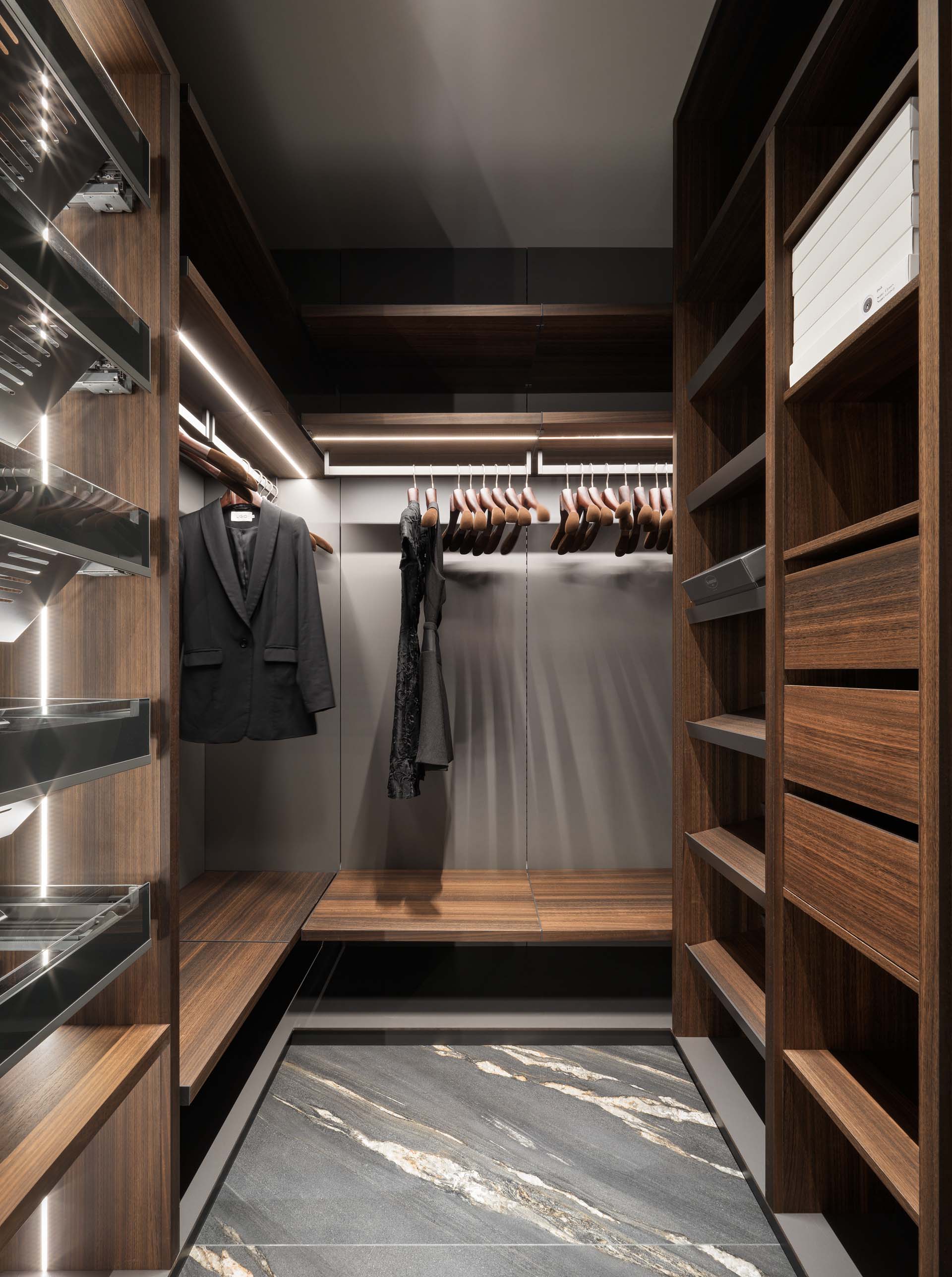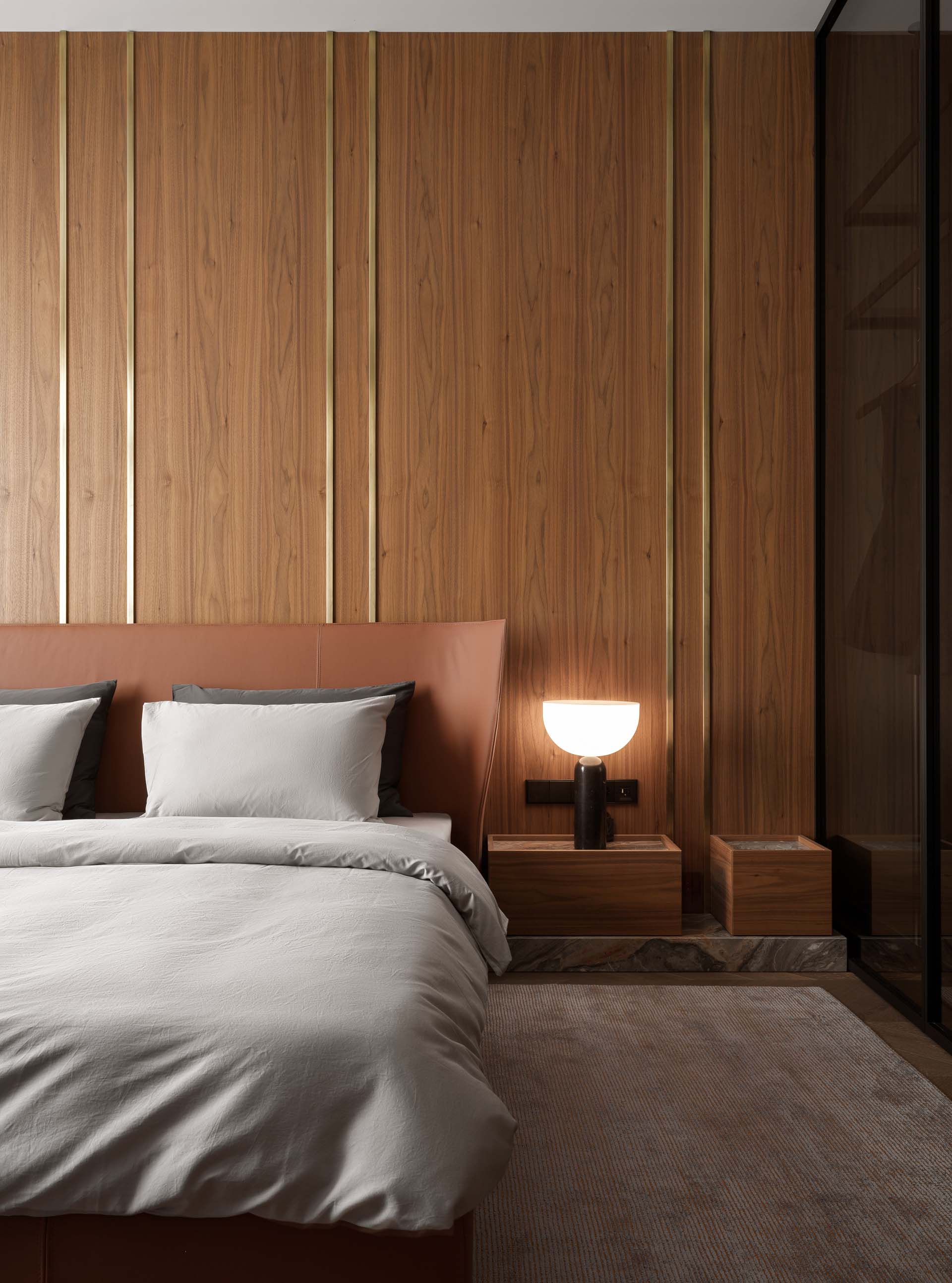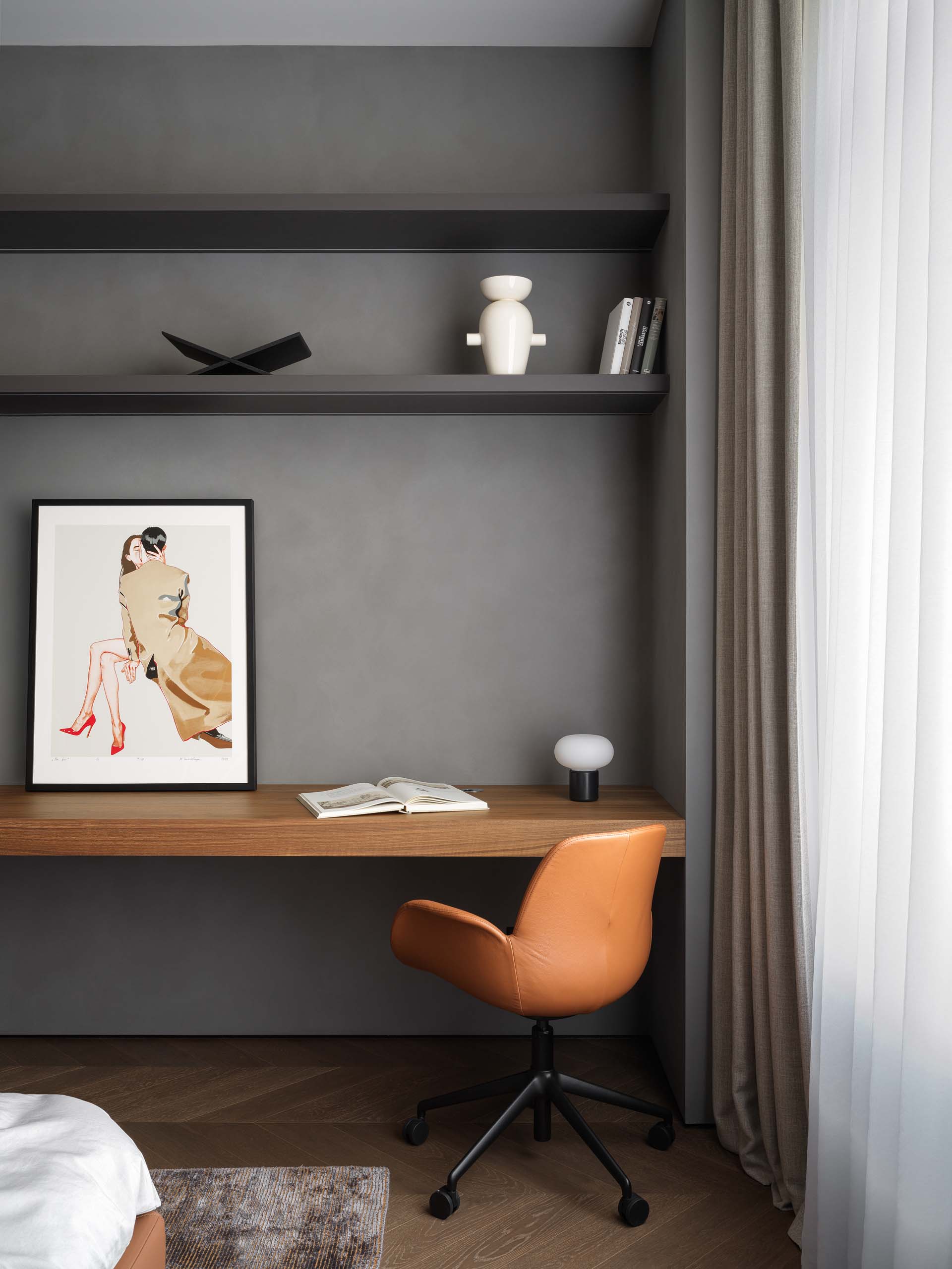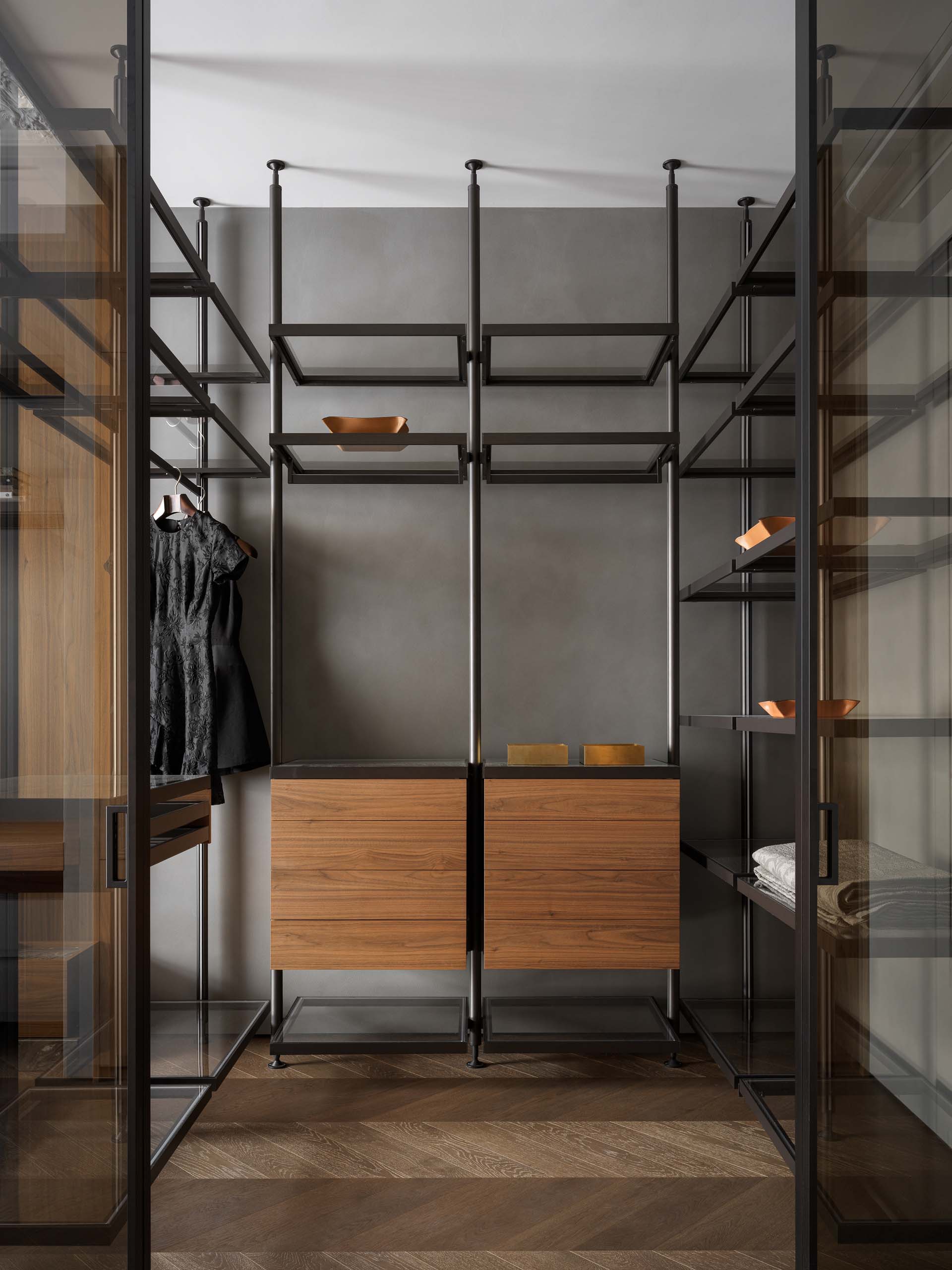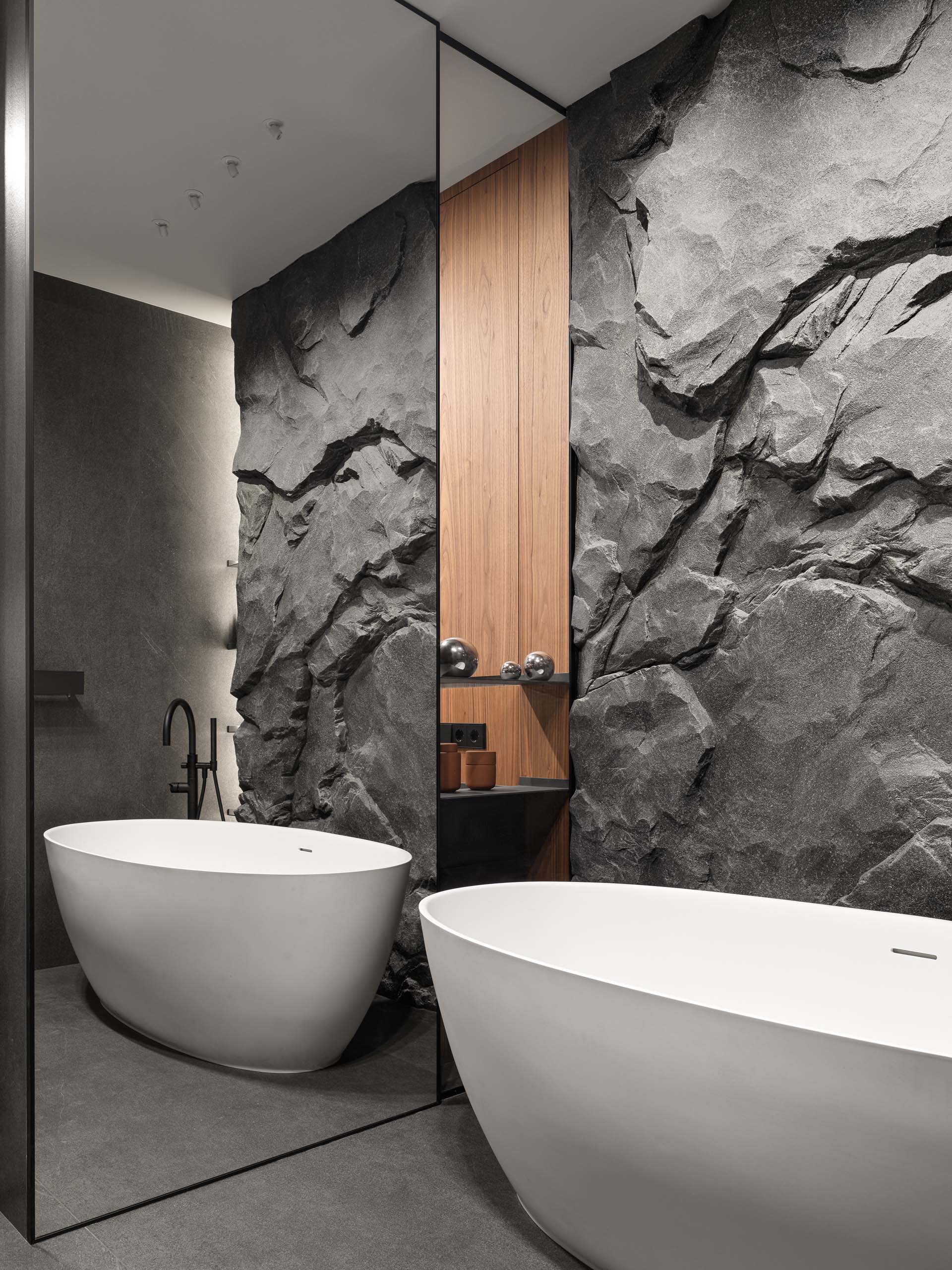 Основу цветовой палитры составили оттенки мореного эвкалипта, рыжей кожи, мрамора и темного гранита. Для гостиной дизайнеры также продумали сложную конструкцию из металла, которая держит мраморную стену. Вес только самого мрамора составил больше 500 кг. С обратной стороны на той же стене размещена четырехметровая парящая столешница без опор. «Это решение потребовало долгих часов работы над проектными решениями и сложными процессами стыковки — но все удалось», — комментируют дизайнеры.