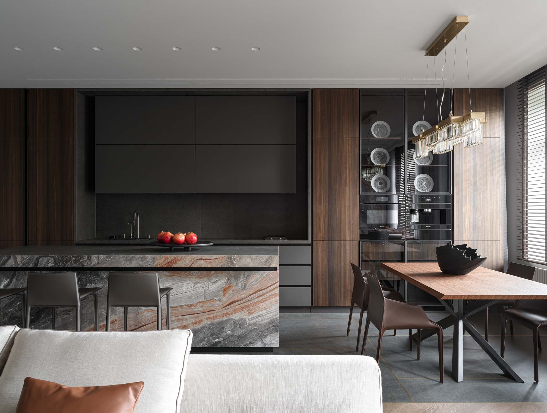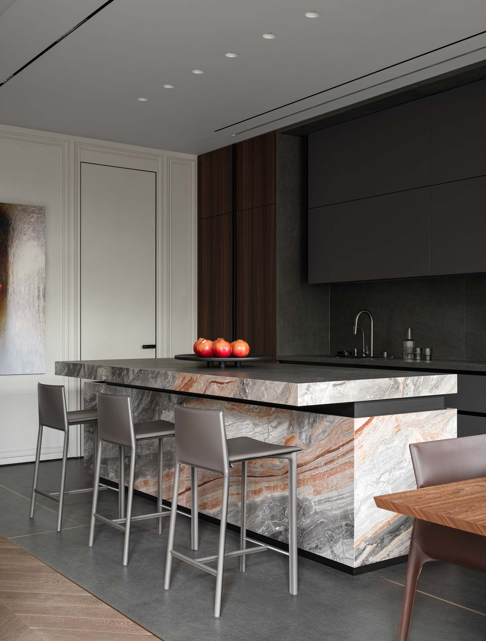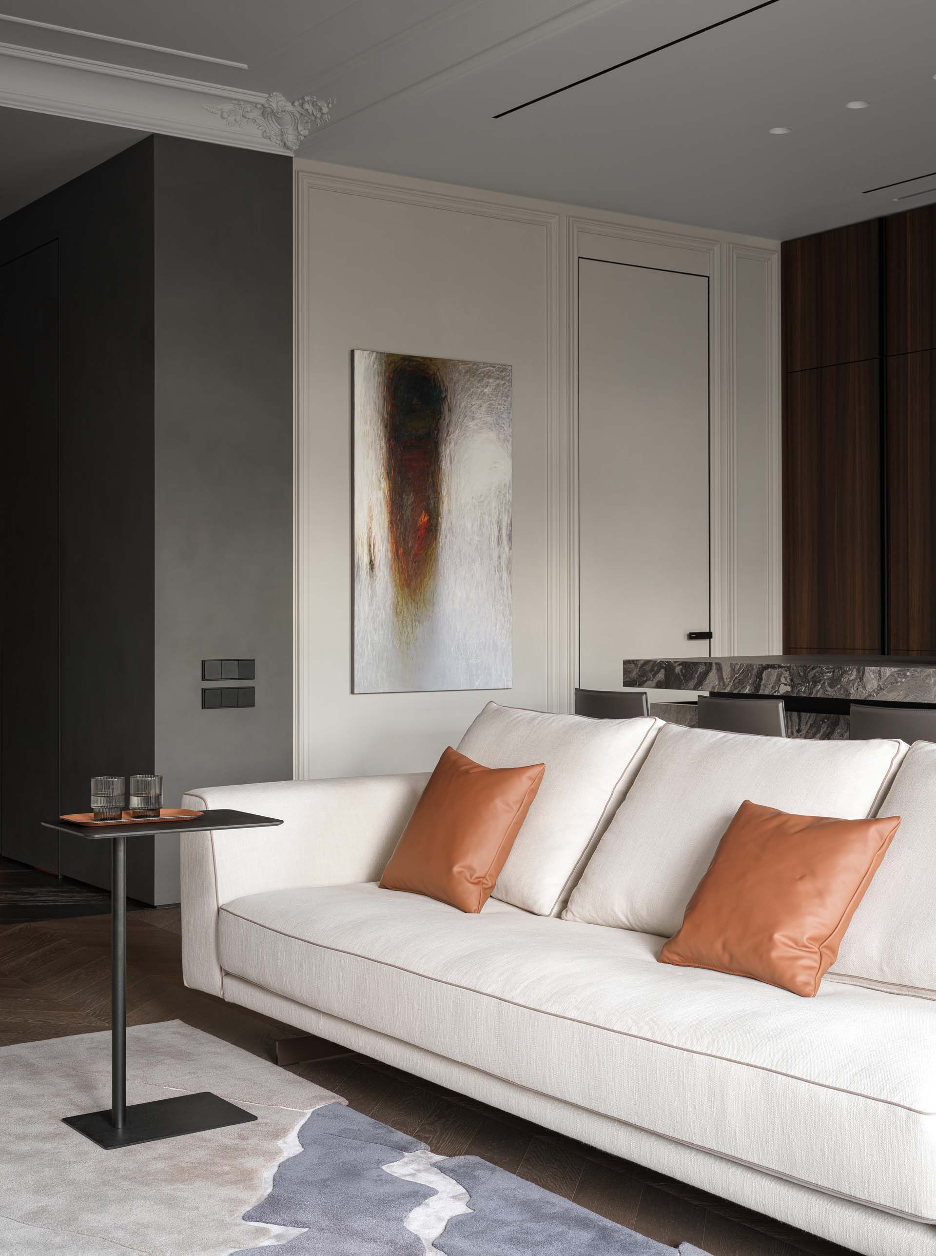 «Нашей задачей было сделать функционально продуманное пространство, наделенное при этом ярким характером, — рассказывают дизайнеры. — Заказчик, большой ценитель итальянского дизайна и искусства, просил, чтобы каждый элемент в гостиной зоне имел историю и был особенным. Так, например, ковер он лично выбрал и привез из Франции. А сердцем проекта стал мрамор Arabescato Orobiko — камень с многослойным узором и красными прожилками, который в интерьере сочетается со шпоном мореного эвкалипта и ореха».