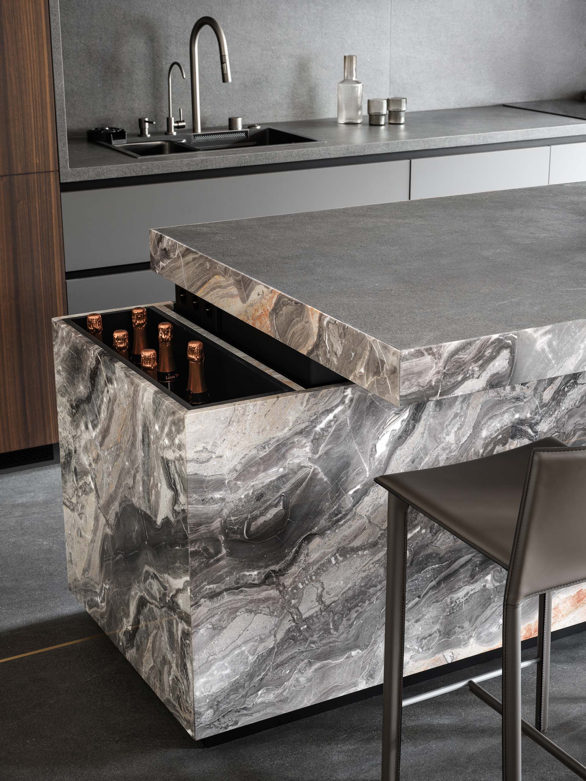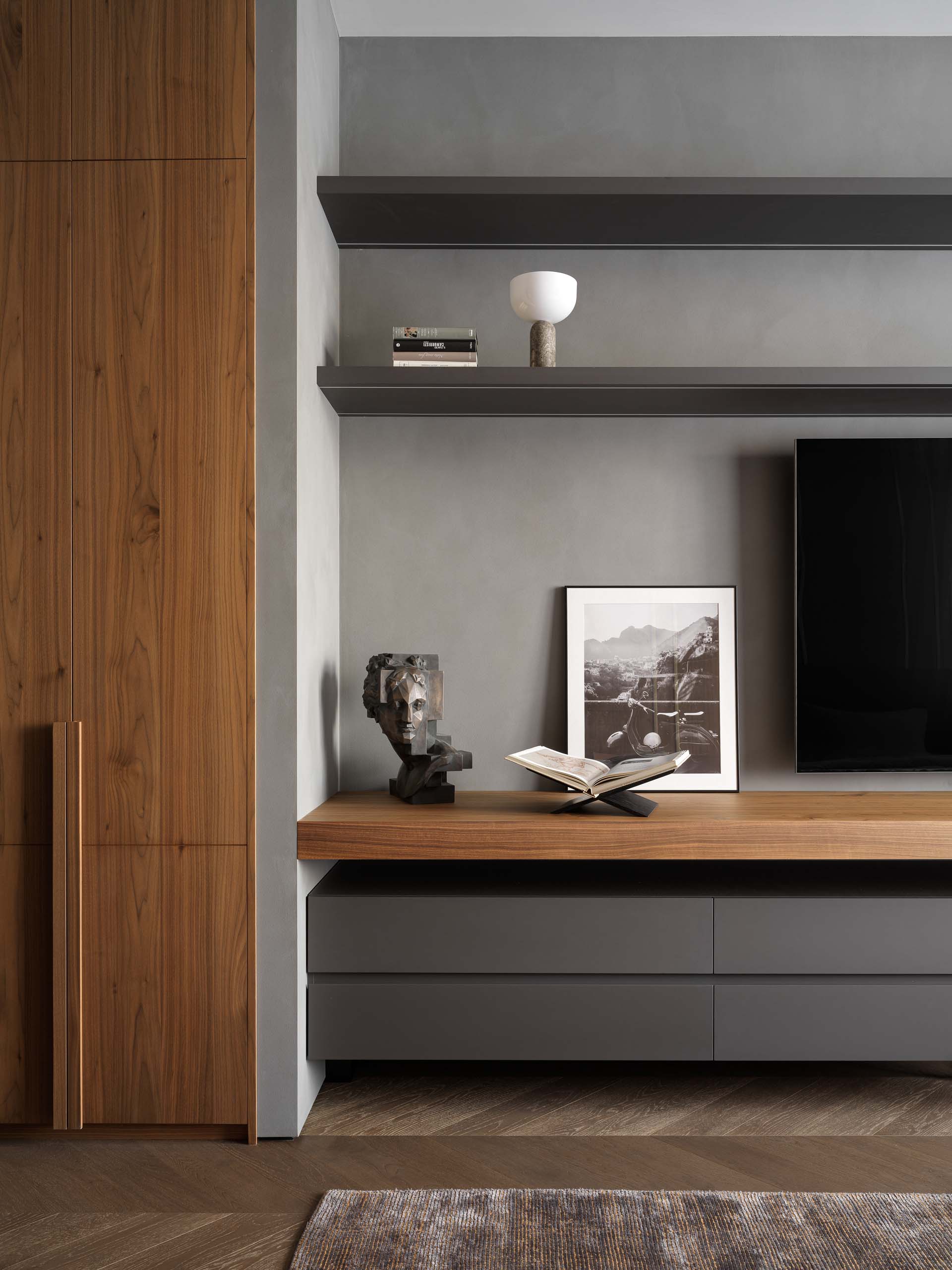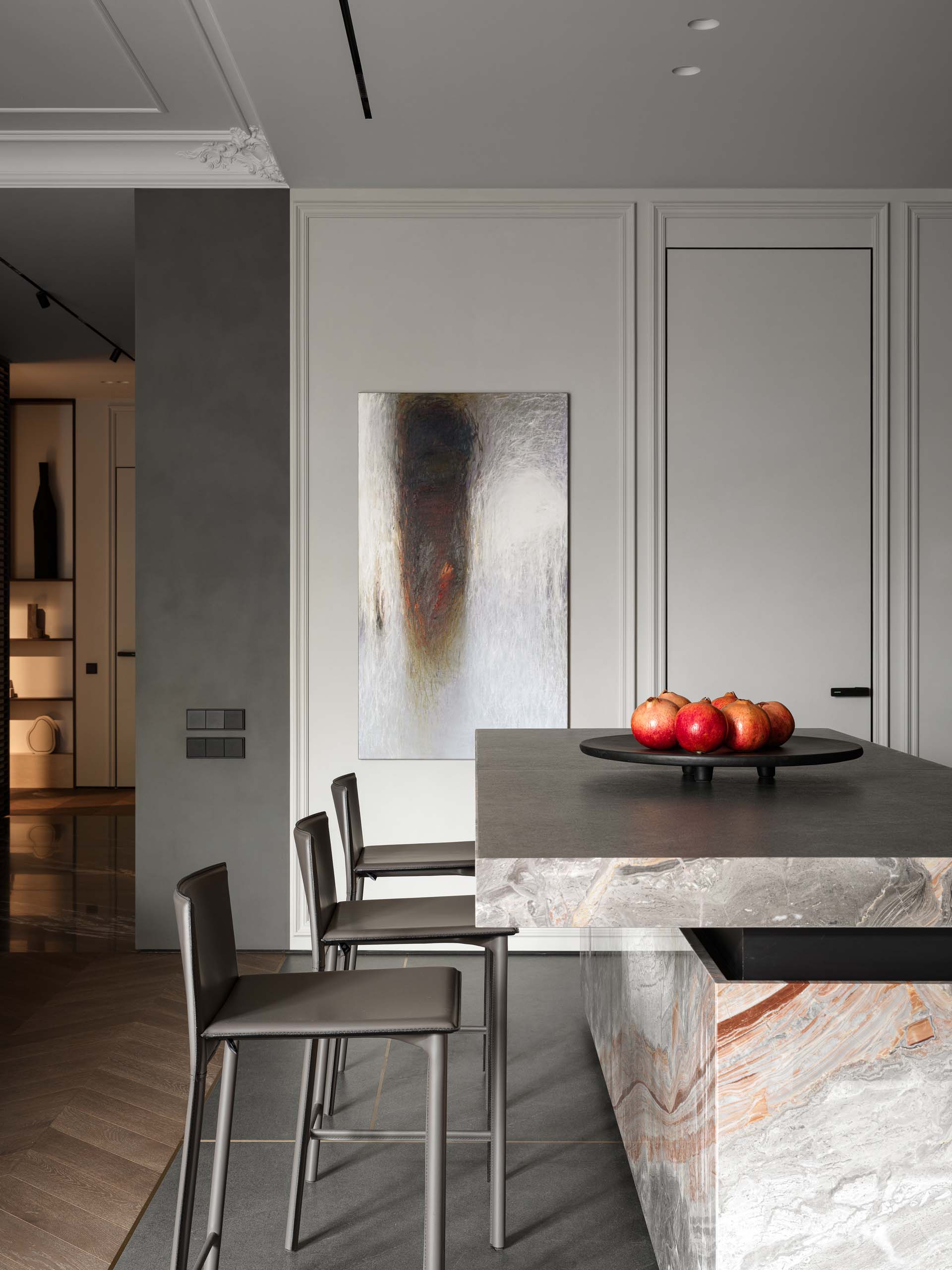 «Нашей задачей было сделать функционально продуманное пространство, наделенное при этом ярким характером, — рассказывают дизайнеры. — Заказчик, большой ценитель итальянского дизайна и искусства, просил, чтобы каждый элемент в гостиной зоне имел историю и был особенным. Так, например, ковер он лично выбрал и привез из Франции. А сердцем проекта стал мрамор Arabescato Orobiko — камень с многослойным узором и красными прожилками, который в интерьере сочетается со шпоном мореного эвкалипта и ореха».