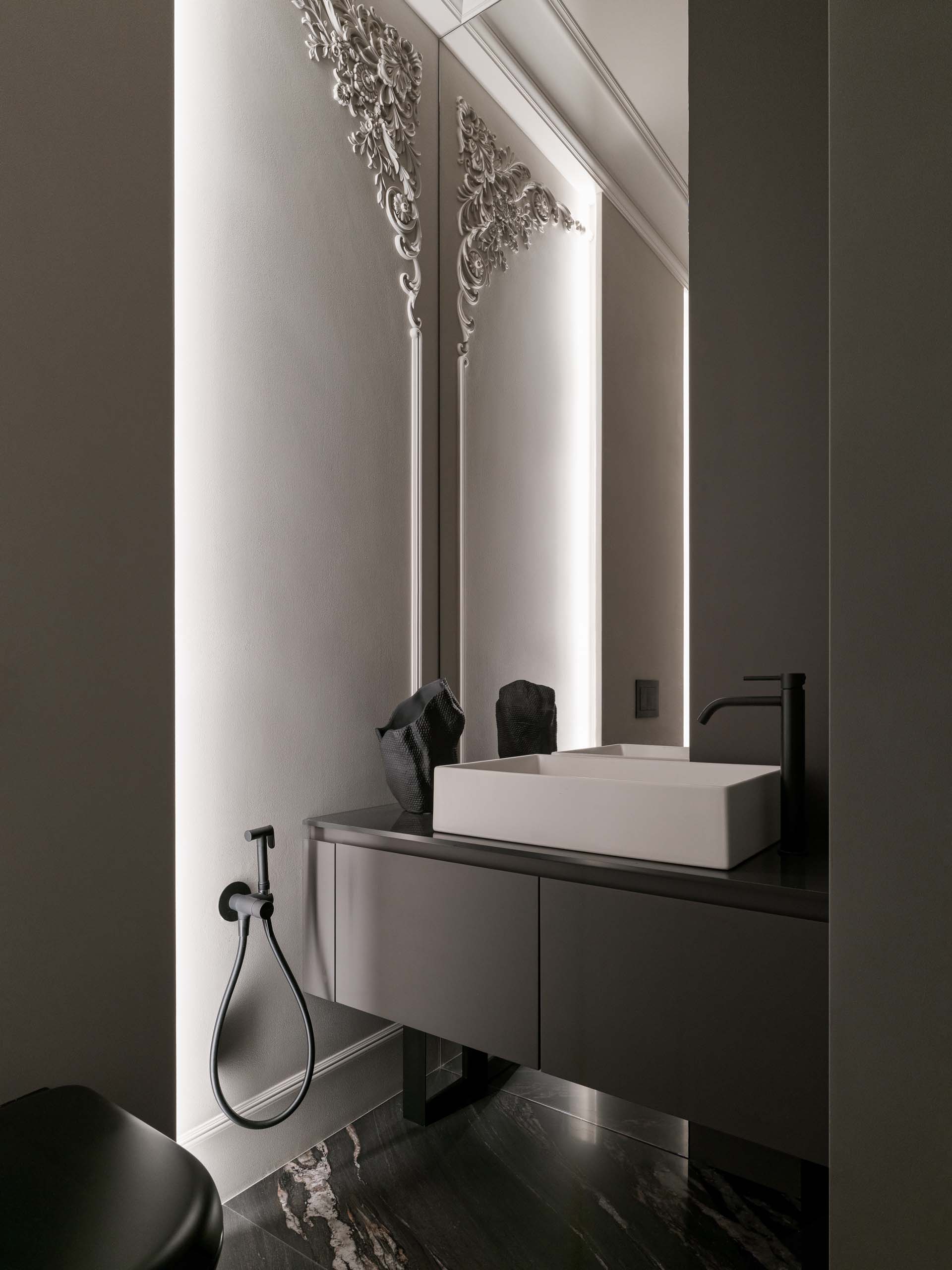 «Несмотря на то что в проекте используются элементы классической отделки, мы применили и множество современных решений, требующих высокого профессионализма как от дизайнеров в подборе материалов, так и от подрядчиков. Мы детально проработали теневые швы, точки соединения фактур, стыки паркета и плитки, вставки из латуни и другие элементы. Все эти простые с виду и иногда незаметные, но важные для проекта решения не были бы возможны без профессионализма строителей, благодаря которому нам вместе удалось создать гармоничный и целостный визуальный образ».