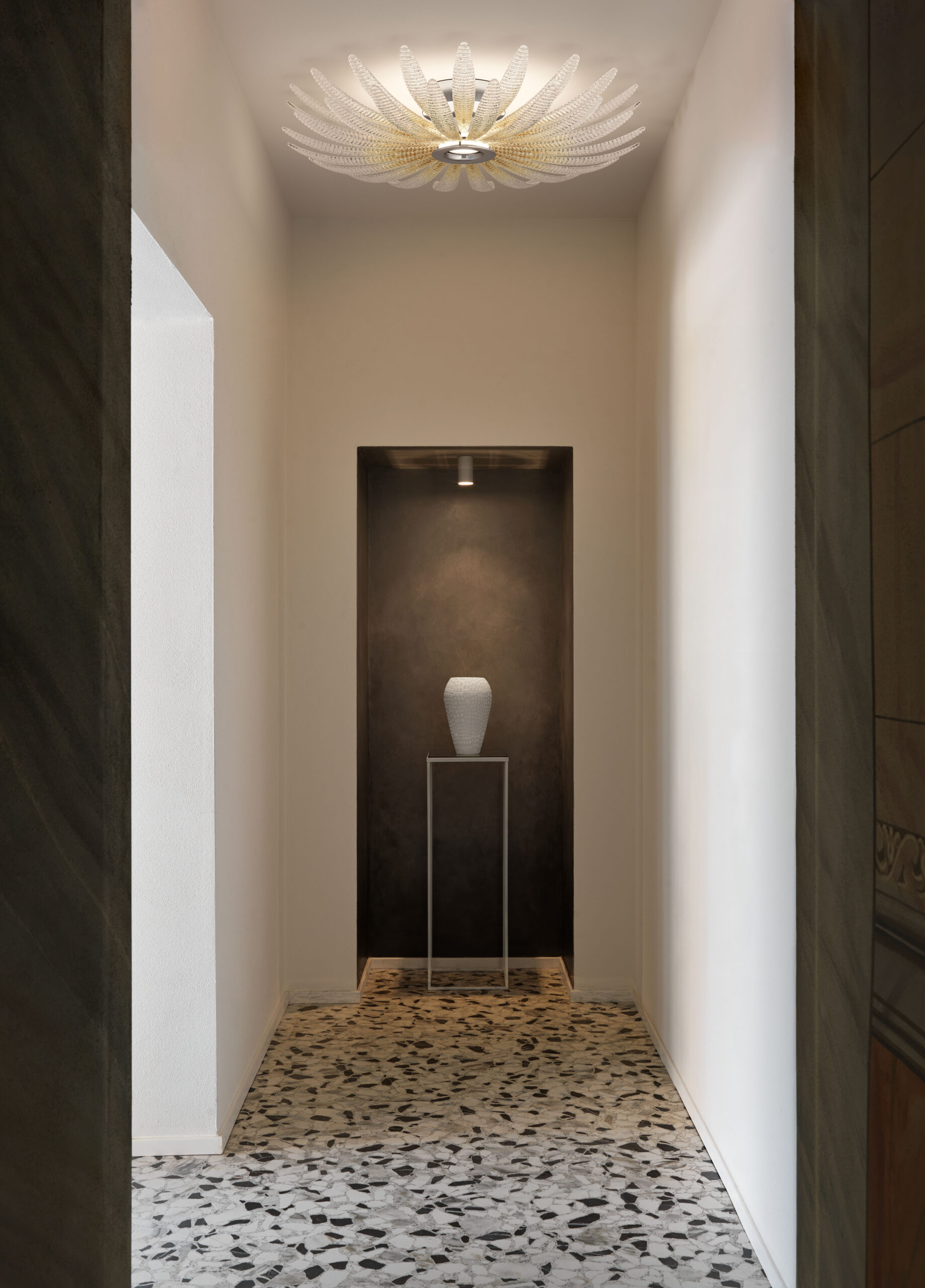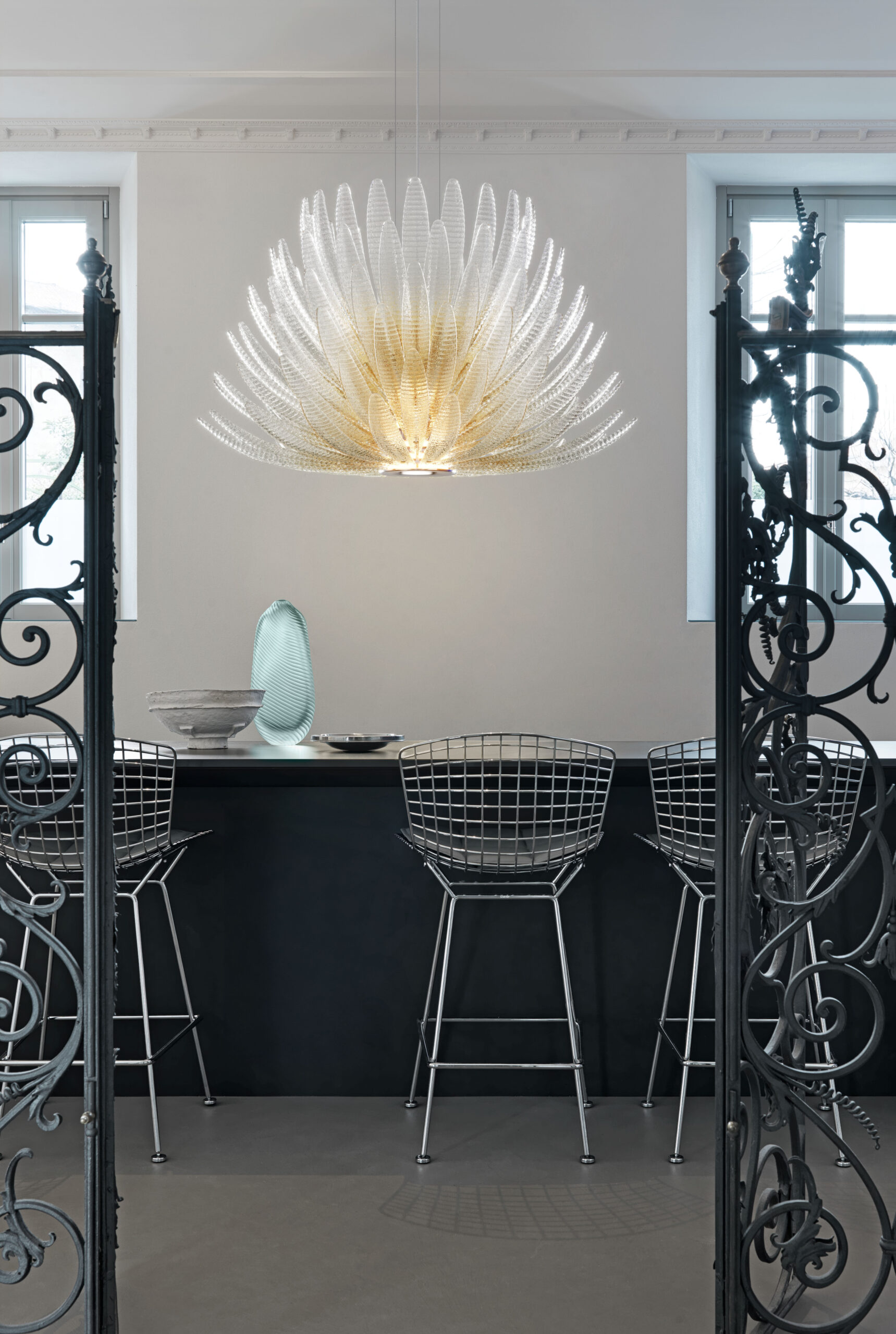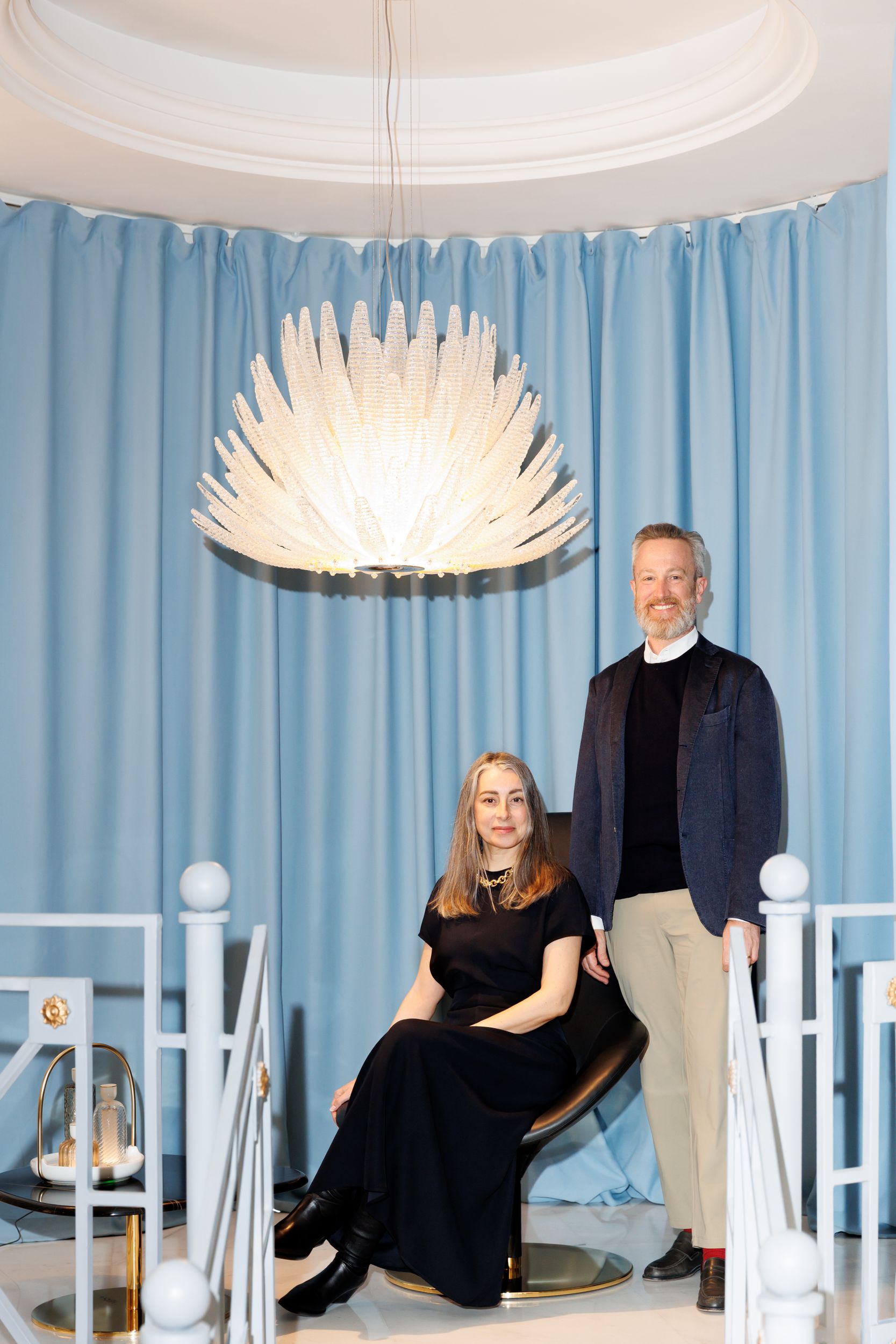 Чинция Agave — одна из наших новинок, которую мы покажем на Неделе дизайна. Мы начали работу с Barovier&Toso с изделия Campanula. Для него мы разработали колпачки, напоминающие цветок колокольчика, а мастера реализовали проект с помощью выдувного стекла и техник balloton и rigamen. Agave же изготовлена с использованием литьевого стекла и специального покрытия rugiada («роса») — это стеклянная пудра, которая придает свету вибрирующий эффект. Мы добавили нюанс: обычно rugiada делается одним цветом, а мы создали градиент. На «лепестках» Agave оттенок плавно переходит от карамельно-коричневого к прозрачному. Из-за этого сердцевина лампы темнее, но в то же время ярче. При этом это не просто арт-объект, а действительно функциональный светильник. Он яркий, но не ослепляющий — с мягким светом.
